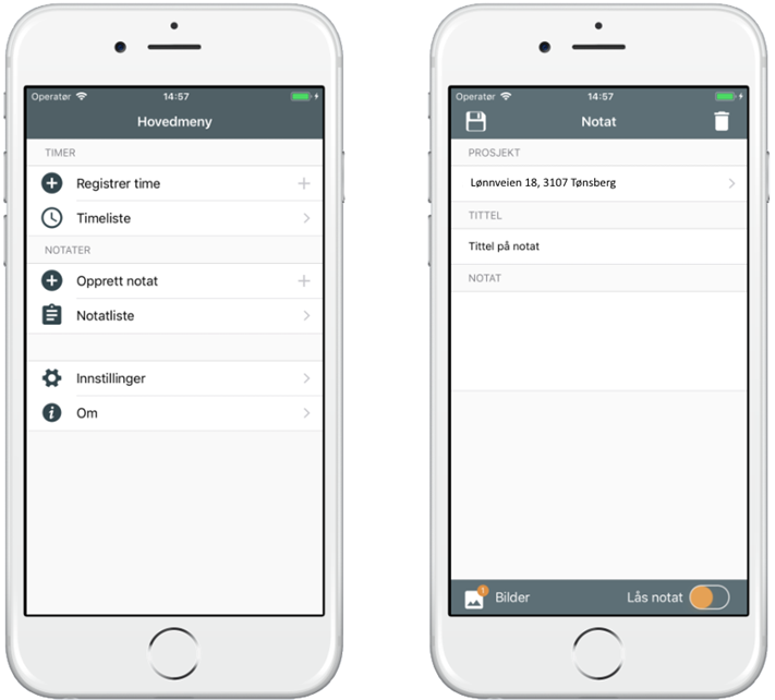 I den første versjonen av appen var det kun mulig å registrere medgått tid på prosjekter. Nå har vi utvidet med å registrere notater med bildedokumentasjon, for eksempel for å lage en huskelapp eller for å dokumentere utførelse på byggeplassen. Særlig viktig er dette for såkalte skjulte bygningsdeler, som for eksempel membran og skjult røropplegg. Legger du til flere bilder til samme notat, kan hvert bilde få sin egen tittel og kommentar.